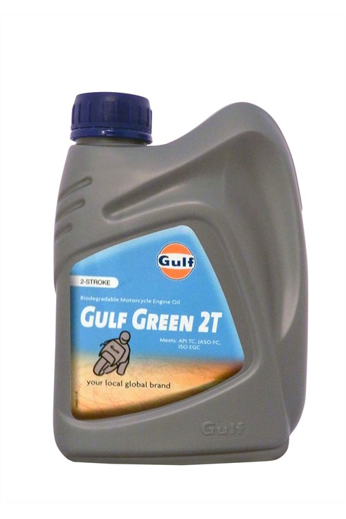 Gulf Green 2T is an environment friendly, fully synthetic biodegradable 2-stroke engine oil for use in high performance air cooled 2-stroke gasoline engines. It is blended from premium quality esters and ashless performance additives to provide excellent engine protection and cleanliness in 2-stroke motorcycle/scooter engines even under harsh operating conditions. The product exceeds the international specifications of